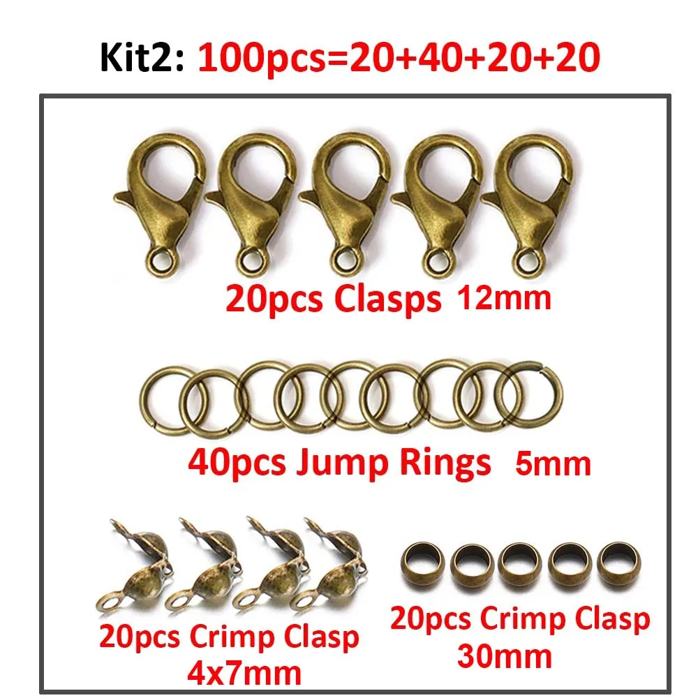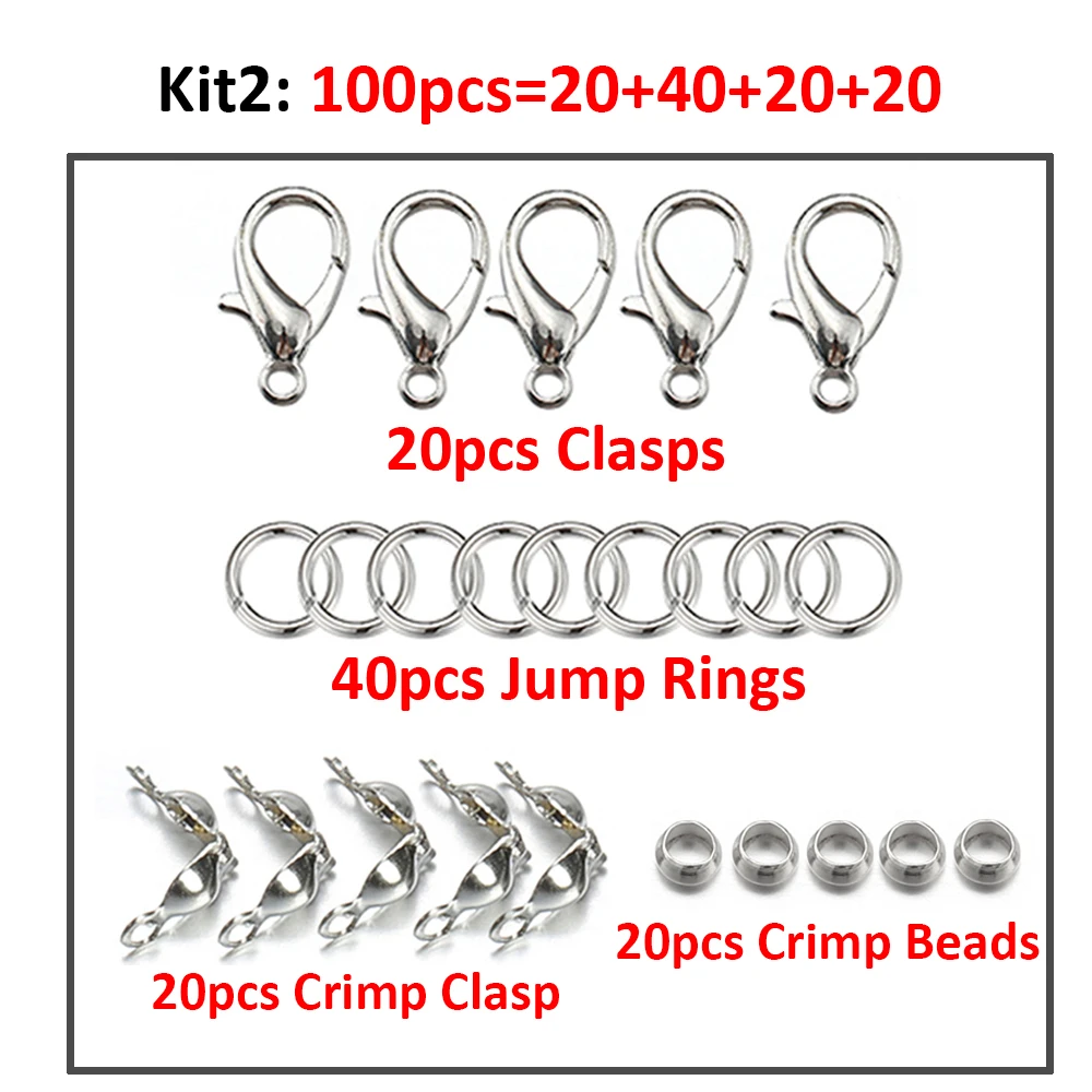 Kit2: 100pcs=20pcs 12mm Lobster Clasps+40pcs 5mm Rings+20pcs 4x7mm Crimp Clasps+20pcs 30mm Crimp Beads.