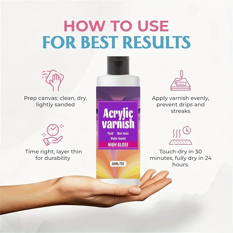 - Versatile Application & Easy to Use: Transparent protective water-based acrylic varnish for use on most surfaces and the steps to use is really easy; Ideal for diverse artistic projects, such as canvas paintings, DIY endeavors, woodwork, bottle art, etc