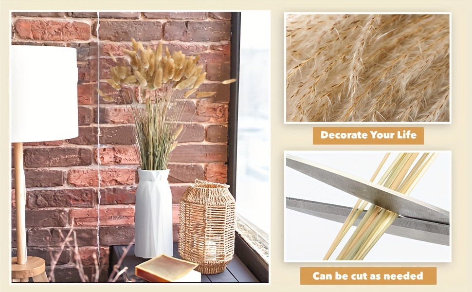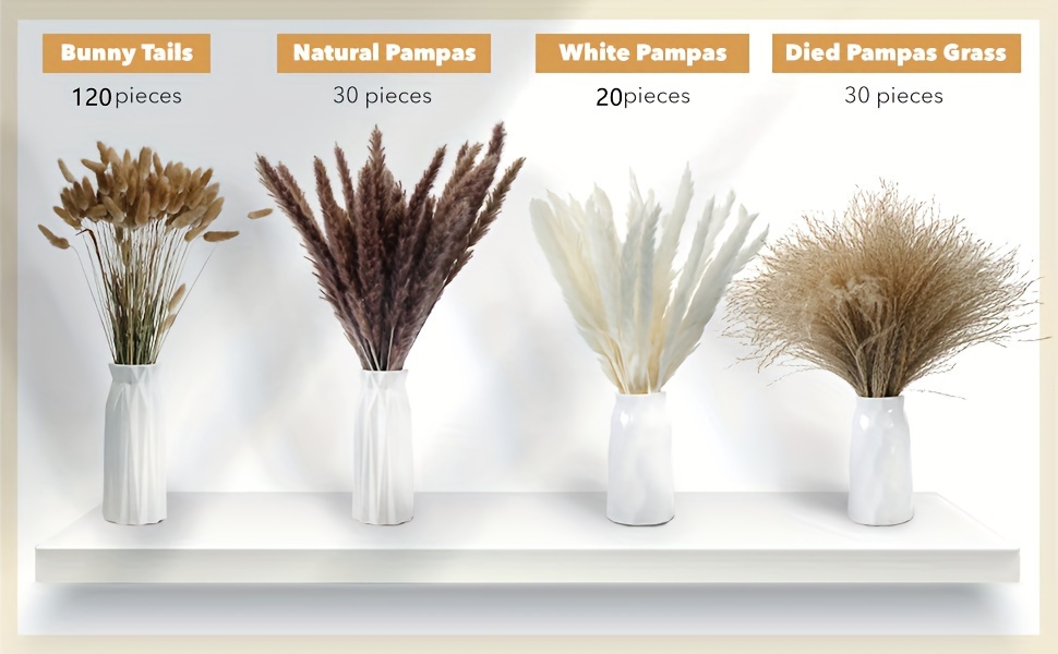 200pcs Artificial Pampas Grass Bundle - Includes 50 Decorations, 30 Natural Dried Feather Grass, 120 Natural Rabbit Tail Grass for Bohemian Table, Country Parties, Shower Decor, Wedding Party, and Home Decor