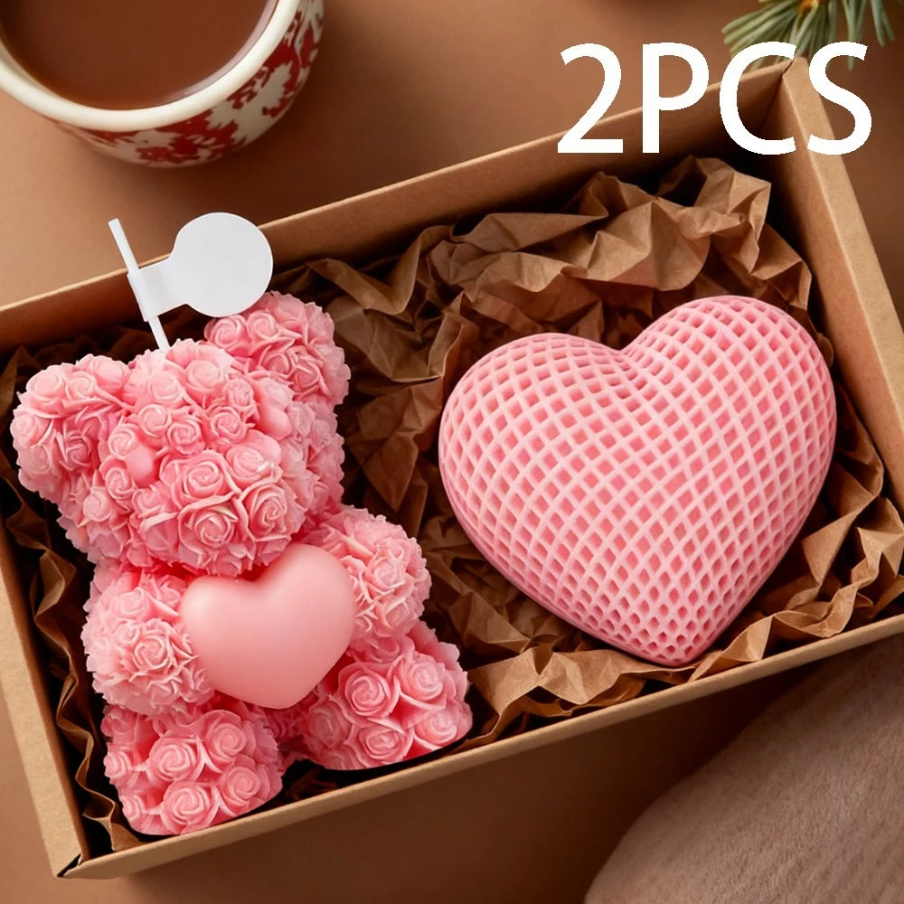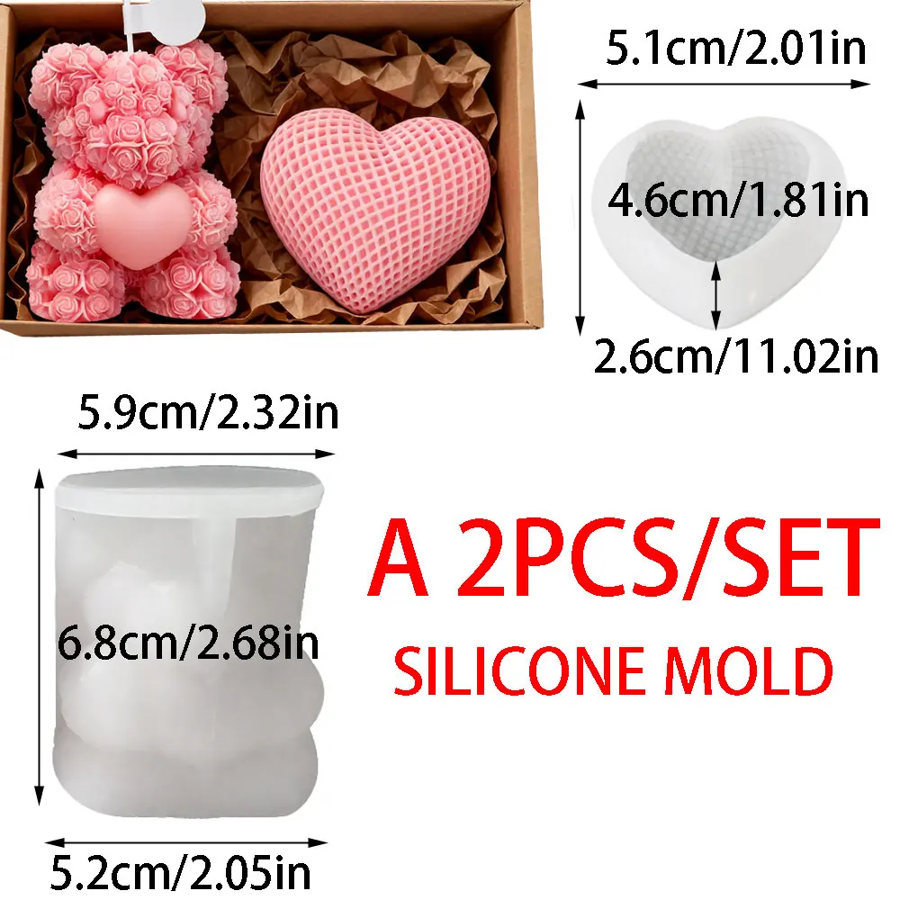 4 Style 2pcs Set Valentine's Day Teddy Bear Silicone Candle Mold Romantic Rose Heart Flower Gypsum Soap Making Tool DIY Souvenir