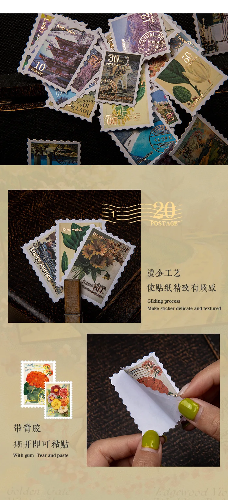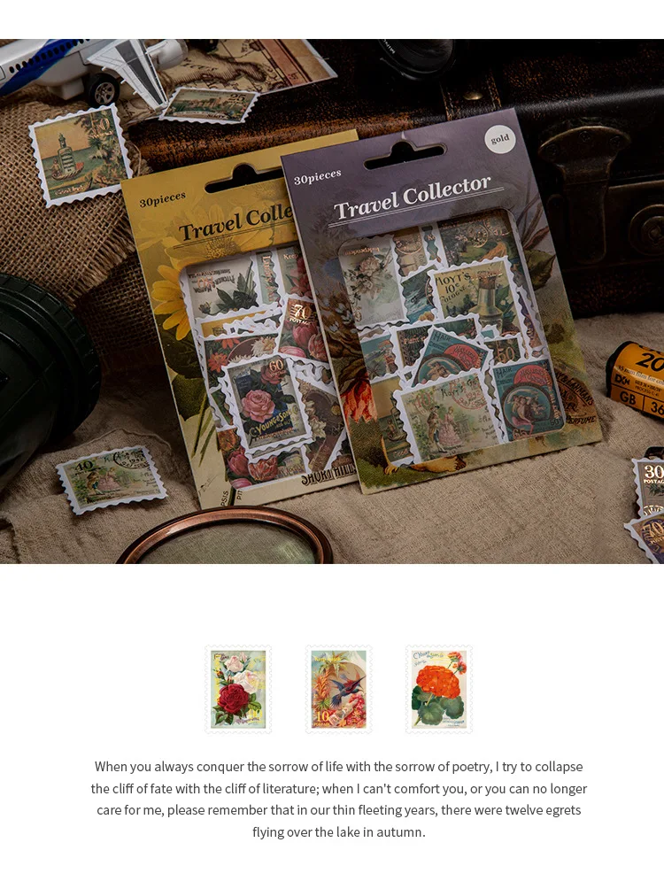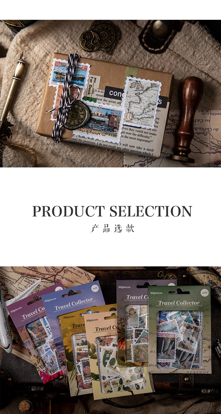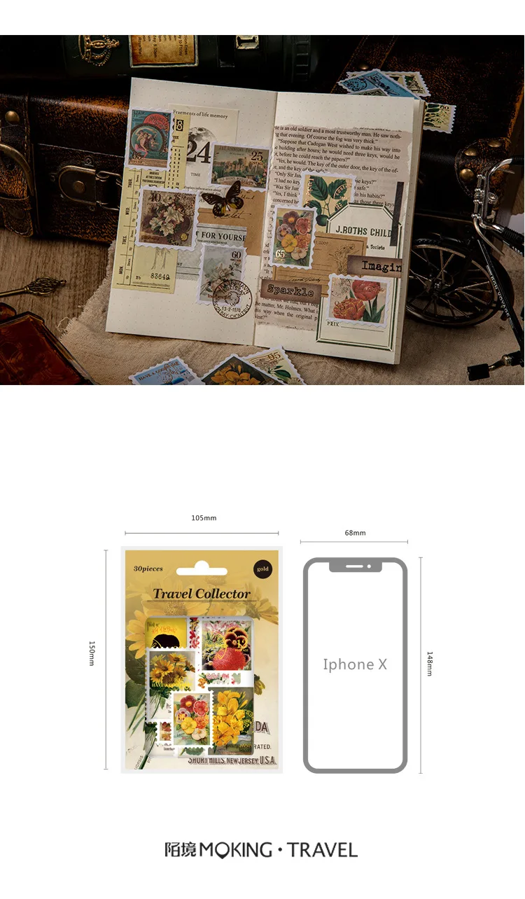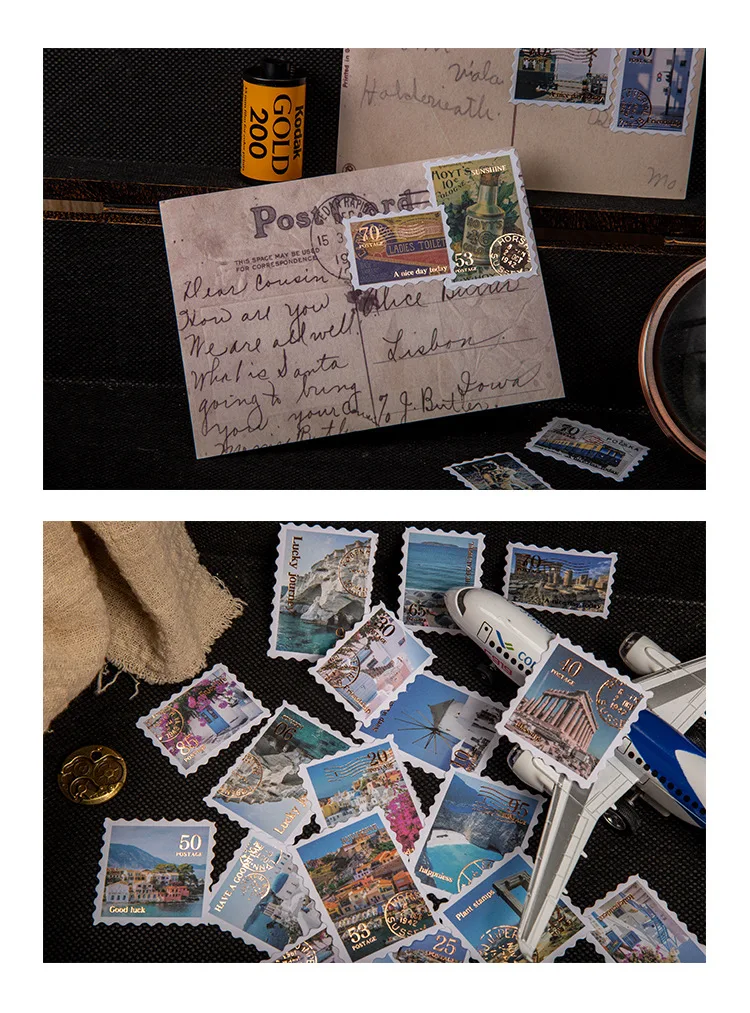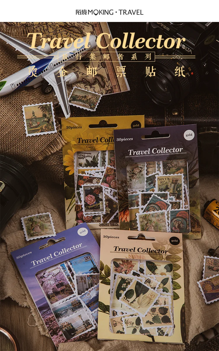 6style 30 pcs Travel Philatelic Stamp Decorative Gold Stickers DIY Scrapbook Label Diary Stationery Album Journal Sticker