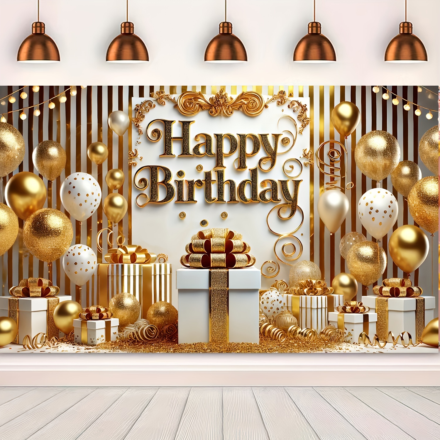 Golden & White Happy Birthday Banner - 70.87x43.31" Polyester Party Decoration Backdrop, Elegant Balloon Design Photography Prop, No Balloons Included
