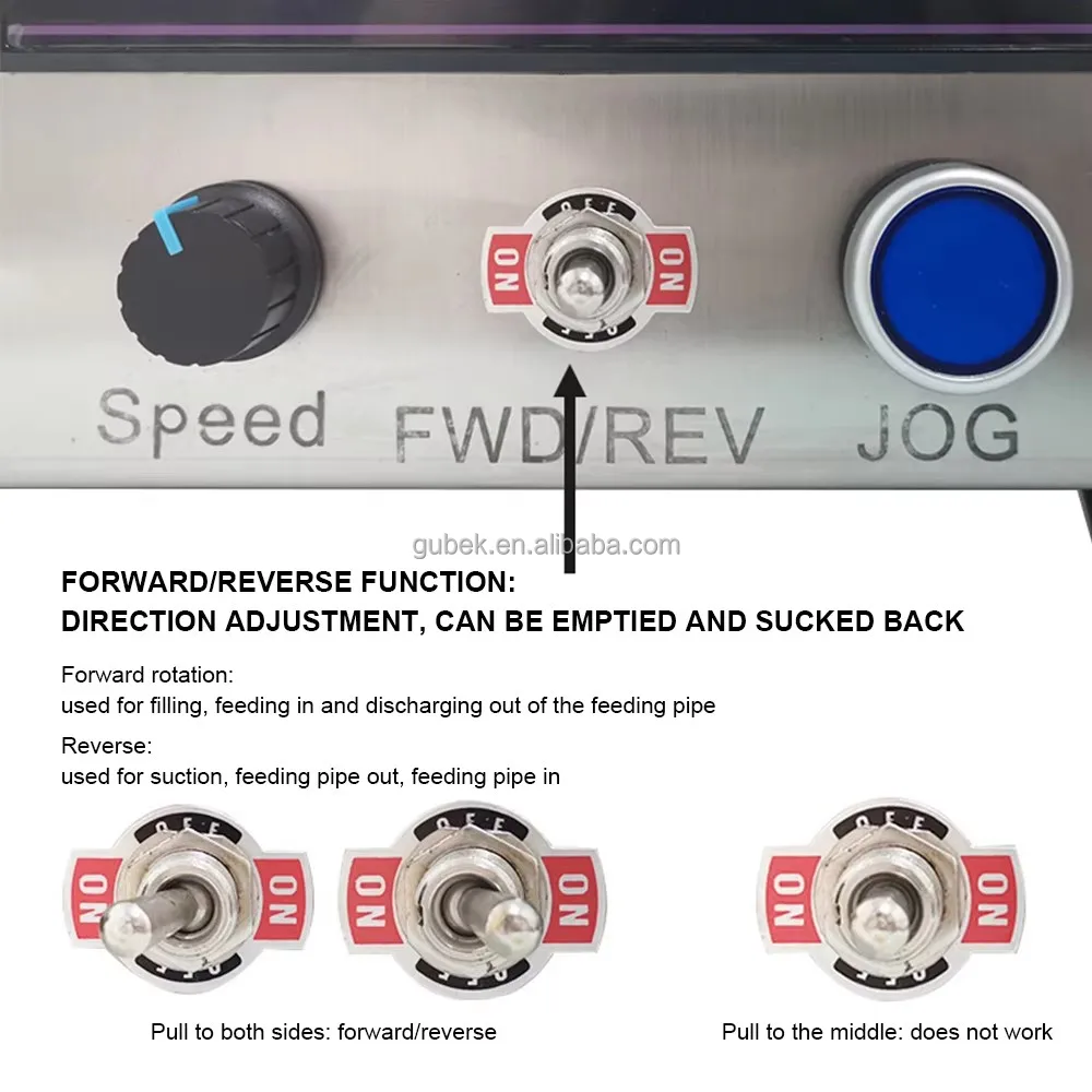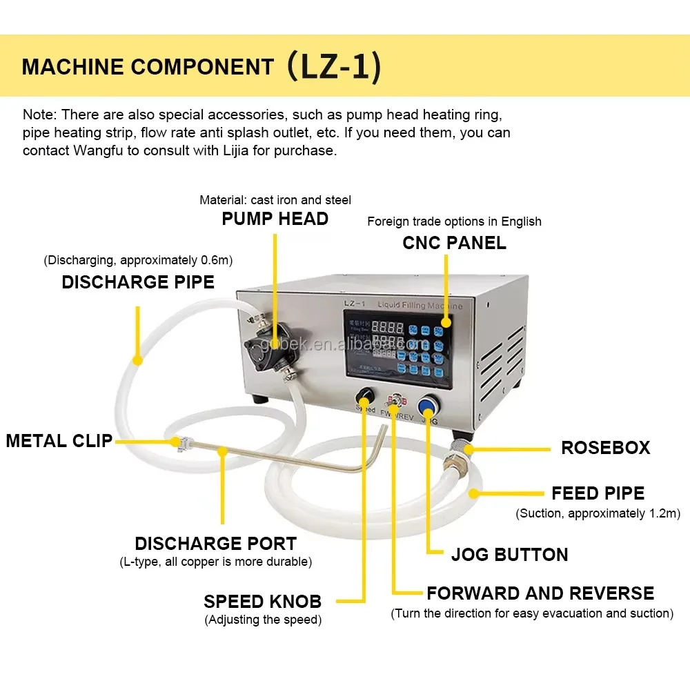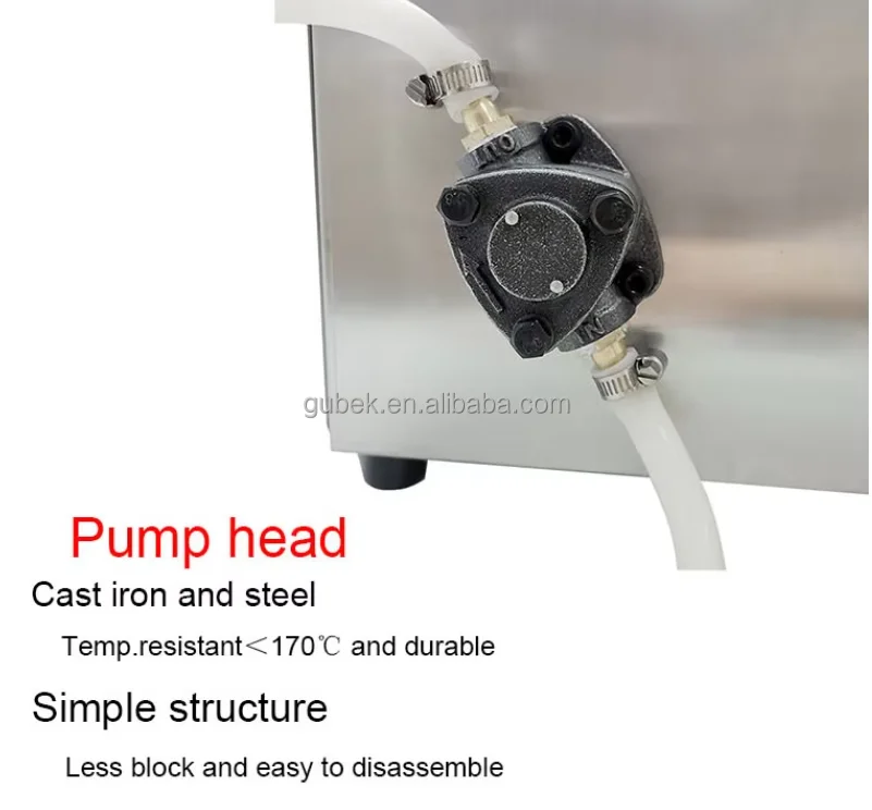 micro-self-priming pump, and controls the working time and intermittent time of the pump by microcomputer to realize the function of quantitative automatic filling. And the structure is simple, easy to operate, often suitable for small enterprises and small shops, families and other filling use. The pump head is made of iron material, which is resistant to high temperature during the filling process, especially suitable for filling oil liquids, such as ghee, candles, etc.