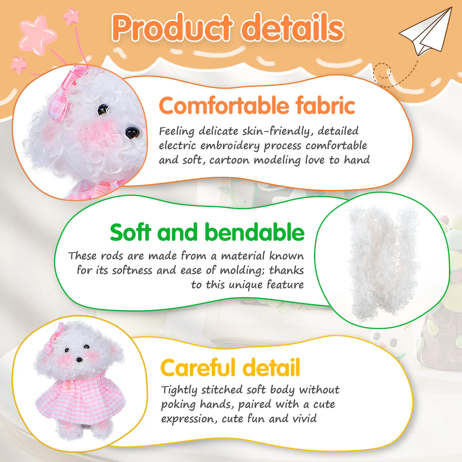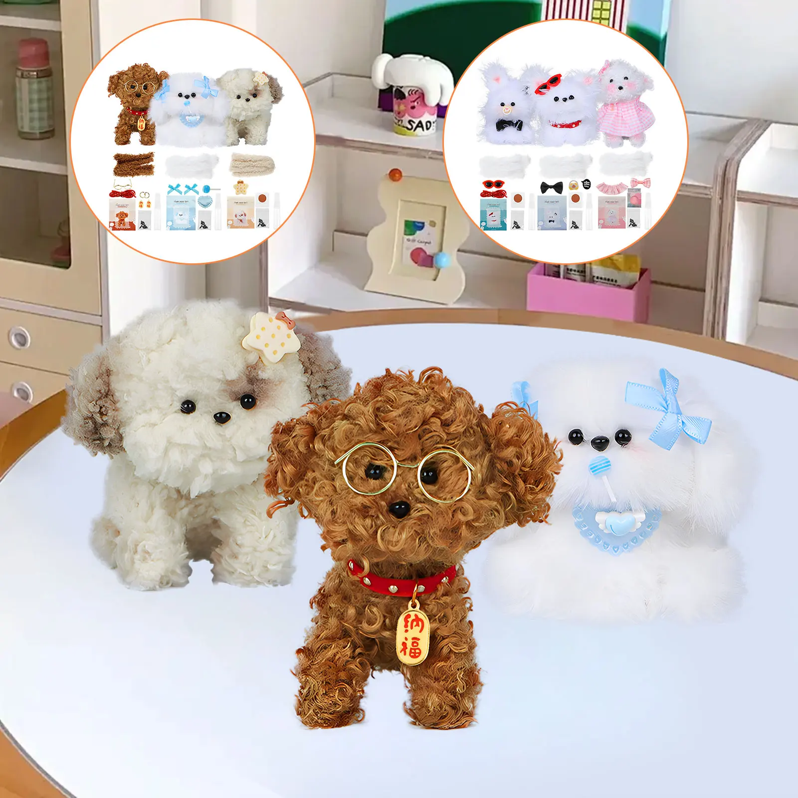Style 2: Light Brown Dog: 1 × Blush 2 × Roll of Rolling Stick 2 × Noses 4 × Eyes 1 × Glue 1 × Decoration 1 × Instruction Manual Brown Dog: 2 × Roll of Rolling Stick 2 × Noses 4 × Eyes 1 × Glue 1 × Instruction Manual 1 × Collar 2 × Pendants 1 × Eyeglass White Dog: 2 × Roll of Rolling Stick 2 × Noses 4 × Eyes 1 × Glue 1 × Instruction Manual 1 × Bow Tie 1 × Lollipop 2 × Bows